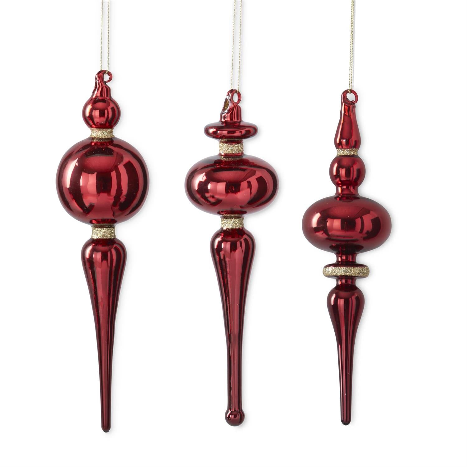Assorted 9 Inch Red Glass Finial Ornament w/Gold Glitter Trim