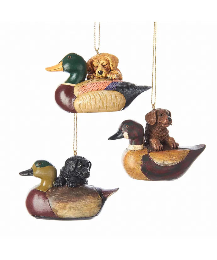 Each ornament showcases exquisite craftsmanship and attention to detail, making them perfect for dog lovers, hunting enthusiasts, or anyone who appreciates whimsical holiday decor. The charming puppies are depicted in lifelike poses alongside traditional duck decoys, creating a nostalgic scene that celebrates the bond between hunters and their faithful companions.