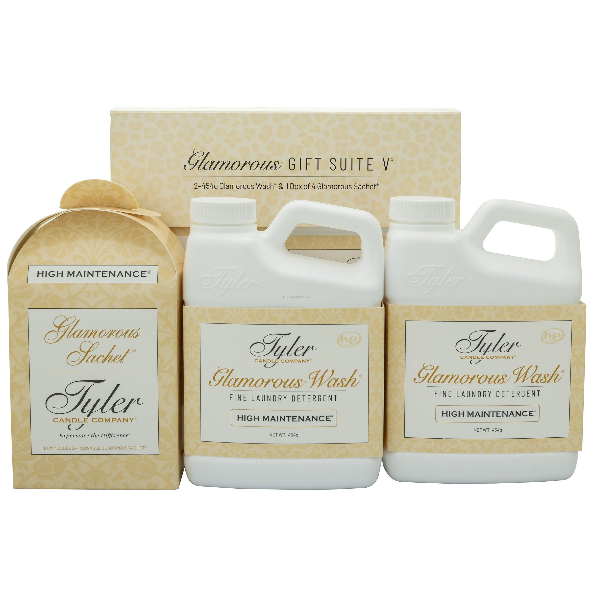 The Glamorous Gift Suite V® is the perfect introduction into the Tyler laundry products! This gift set includes two 16oz bottles of Glamorous Wash and a laundry sachet in High Maintenance fragrance.